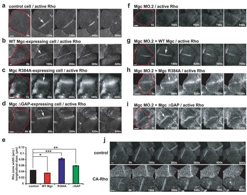 Figure 2. Testing the GTPase flux modelaâd, Embryos were injected with GFP-rGBD to monitor active Rho along with WT Mgc (b), Mgc R384A (c), or Mgc ÎGAP (d) and imaged during cytokinesis. Frames taken from time-lapse movies are shown. A single blastomere is outlined in red in the first frame, and the Rho activity zone is marked with an arrow in the second frame. Scale bars, 40 μm. e, Average Rho zone width / longitudinal diameter for multiple cells. Mean ± SE. Control, n = 12 embryos; WT Mgc, n = 9; R384A, n = 10; ÎGAP, n = 12. *p < 0.05; **p < 0.01; ***p < 0.005. fâi, Gene replacement experiments where embryos were injected with Mgc MO.2 to knock down endogenous MgcRacGAP along with mRNAs for WT Mgc (g), Mgc R384A (h), or Mgc ÎGAP (i). The embryos were also injected with GFP-rGBD to monitor active Rho. A single blastomere is outlined in red in the first frame, and the Rho activity zone is marked with an arrow in the second frame. Scale bars, 40 μm. j, Effects of constitutively-active Rho (CA-Rho) on Rho zone dynamics. Frames taken from time-lapse movies showing Rho activity dynamics during cytokinesis in control cells and cells expressing CA-Rho are shown. Cytokinetic Rho zones (arrows) are broader and brighter in cells expressing CA-Rho and are much slower to furrow. Moreover, the amount of Rho activity outside the equtorial regions is much higher in those cells expressing CA-Rho than the controls. Note that these phenotypes closely resemble those obtained with the R384A GAP-DEAD mutant. Scale bars, 40 μm.
