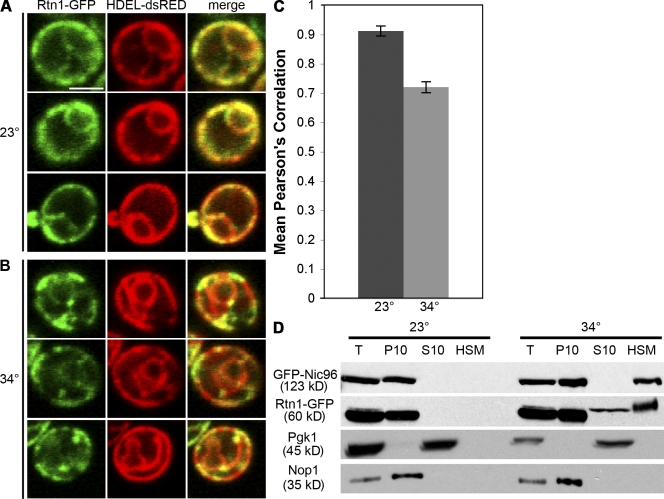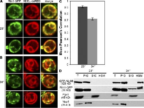 Figure 1. Rtn1-GFP mislocalizes and is associated with an HSM fraction in the prp20-G282S assembly mutant. (A and B) Rtn1-GFP and dsRed-HDEL localization in the prp20-G282S mutant background was visualized by direct laser-scanning confocal microscopy. The prp20-G282S mutant (SWY3747) was grown to early log phase (23°C; A) and shifted to 34°C for 5 h (B). Single-channel fluorescence is shown from three representative cells at each temperature, and merged images are shown (right). (C) Quantitative analysis of relative Rtn1-GFP and dsRed-HDEL distribution in prp20-G282S cells at 23 and 34°C. n = 12 cells for each respective Pearson's coefficient of correlation (+1.0 = complete coincidence; −1.0 = no coincidence). Error bars represent standard deviation. (D) Biochemical fractionation was performed with rtn1-GFP GFP-nic96 prp20-G282S cells (SWY3748) grown to early log phase (23°C) and shifted to 34°C for 5 h. After lysis, subcellular fractionation was performed by differential centrifugation. Cellular equivalent fractions of the total lysate (T), pellet (P; 10,000 g), and supernatant (S; 10,000 g) fractions and 10 times the cellular equivalent of the HSM fraction (135,000-g pellet from the supernatant fraction) were separated by SDS-PAGE, transferred to nitrocellulose, and analyzed by immunoblotting with an anti-GFP. Distributions of cytoplasmic Pgk1 and nucleolar Nop1 were analyzed as controls. Bar, 2.5 µm. |
