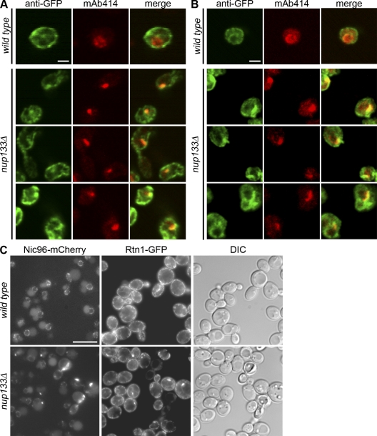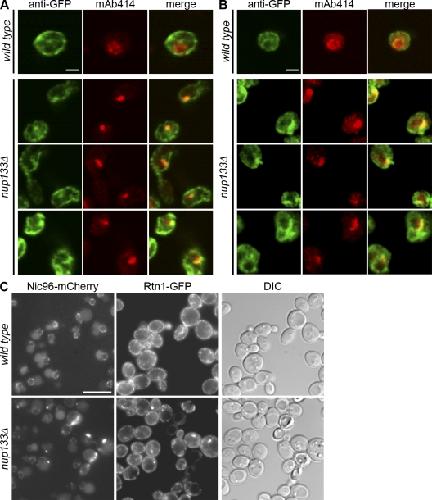 Figure 2. Rtn1-GFP and Yop1-GFP are associated with NPC clusters in the nup133Δ mutant. (A and B) Indirect immunofluorescence microscopy was conducted with parental rtn1-GFP cells (A, top), nup133Δ rtn1-GFP cells (SWY4007; A), parental yop1-GFP cells (B, top), or nup133Δ yop1-GFP cells (SWY4045; B) grown to early log phase at 23°C using rabbit anti-GFP and mouse anti–FG Nup mAb414 antibodies. Direct laser-scanning confocal microscopy was used with single-channel fluorescence for the GFP and mAb414 staining shown from three representative fields. Merged images are shown (right). (C) Live cell direct fluorescence microscopy was conducted with rtn1-GFP nic96-mCherry (SWY4125) and rtn1-GFP nic96-mCherry nup133Δ cells (SWY2117) grown to early log phase at 23°C. DIC, differential interference contrast. Bars: (A and B) 2.5 µm; (C) 10 µm. |