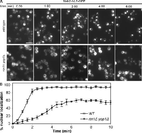 Figure 5. The rtn1Δ yop1Δ mutant has Nab2NLS-GFP nuclear import defects. Parental (BY4742) and rtn1Δ yop1Δ (SWY3811) cells with a plasmid expressing Nab2NLS-GFP (pNS167; Shulga et al., 2000) were grown to early log phase at 23°C. Import kinetics were determined after shifting energy-depleted cells with cytoplasmic Nab2NLS-GFP to glucose-containing media. (A) Localization of Nab2NLS-GFP by direct fluorescence microscopy at time points (minutes) after reinitiating import. (B) Kinetic data for three independent trials. Error bars represent standard deviation. Bar, 10 µm. |