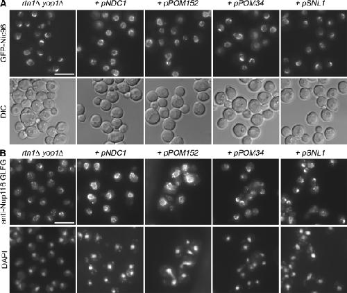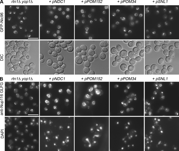 Figure 7. Exogenous expression of Ndc1 and Pom152 rescues the rtn1Δ yop1Δ Nup mislocalization phenotype. (A and B) The rtn1Δ yop1Δ GFP-nic96 (SWY3931; A) and the rtn1Δ yop1Δ (SWY3811; B) strains were transformed with plasmids expressing NDC1 (pRS315.NDC1; Chial et al., 1998), POM152 (pSW229), POM34 (pSW1517; Miao et al., 2006), or SNL1 (pSW575; Ho et al., 1998). Direct fluorescence microscopy (A) or indirect immunofluorescence microscopy with anti–Nup116-GLFG antibodies (B) was conducted to evaluate NPC clusters. DIC, differential interference contrast. Bars, 10 µm. |