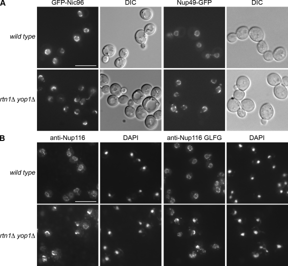 Figure 3. Nups mislocalize in the rtn1Δ yop1Δ mutant. (A) Parental cells (SWY1695 or SWY809) or rtn1Δ yop1Δ cells expressing either GFP-Nic96 or Nup49-GFP (SWY3931 or SWY3880) were grown to early log phase at 23°C and were visualized by direct fluorescence microscopy. (B) Parental cells (BY4742) or rtn1Δ yop1Δ cells (SWY3811) were grown to early log phase at 23°C and processed for indirect immunofluorescence microscopy with anti-Nup116C or anti–Nup116-GLFG antibodies. Nuclei were detected with the DNA dye DAPI. DIC, differential interference contrast. Bars, 10 µm. |