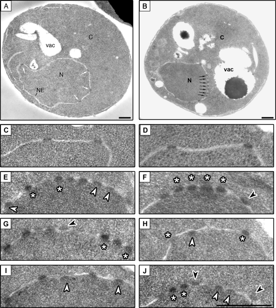 Figure 4. NPCs are clustered and morphologically abnormal in rtn1Δ yop1Δ cells. (A–J) Parental cells (BY4742; A, C, and D) or rtn1Δ yop1Δ cells (SWY3811; B and E–J) were grown to early log phase at 23°C and processed for thin-section EM. Black and white arrows point to the NPC, black arrowheads point to NPC-like structures at the ONM, white arrowheads point to NPC-like structures at the INM, and the asterisks denote other aberrant NPC-like structures at the NE. N, nucleus; C, cytoplasm; vac, vacuole. Bars, 0.5 µm. |