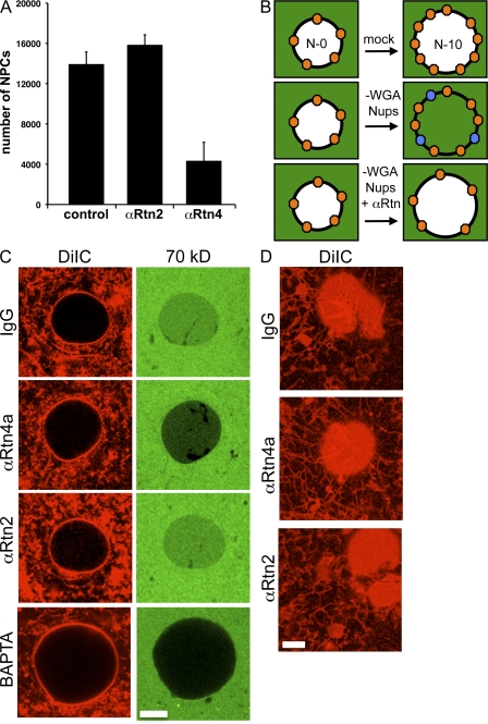 Figure 8. Xenopus Rtn4a is required for de novo NPC formation in vitro. (A) Inhibition of NPC insertion by anti–(α)-Rtn4a but not anti–(α)-Rtn2 antibodies. Preassembled nuclei were incubated with fresh cytosol in the presence of 10 µM of antibodies for 30 min, and pores were visualized by fluorescently labeled WGA. The NPC number of 50 nuclei is plotted. Error bars represent standard deviation. (B) Schematic illustration of dextran influx assay. When preassembled nuclei (N-0) are incubated with mock-depleted cytosol, intact new pores are inserted (orange circles). In contrast, when N-0 nuclei are incubated with WGA-depleted cytosol, new pores form that cannot exclude dextran (blue circles). If RTNs are required for an early step of NPC assembly, pore/hole formation should be blocked and 70-kD dextran should be excluded. (C) Nuclei were assembled with DiIC16(3)-labeled membranes (red) and incubated with WGA-depleted cytosol in the absence (IgG and α-Rtn2) or presence of inhibitory antibodies (α-Rtn4a) or the calcium chelator BAPTA. After a 10-min incubation, fluorescently labeled 70-kD dextran was added (green), and nuclei were immediately imaged using confocal microscopy (n ≥ 20). (D) In the same reactions as C, surface images were taken from unfixed nuclei that did not exclude (IgG and α-Rtn2) or did exclude (α-Rtn4a) 70-kD dextran. Under all conditions, the NEs were visible as flat membrane patches connected to intact ER tubules. Bars, 10 µm. |