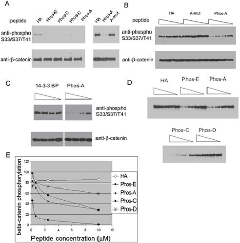 Figure 3. Phosphorylated PPPSPXS peptides inhibit β-catenin phosphorylation by GSK3 in vitro.A. The HA, Phos-E, Phos-C, Phos-D and Phos-A peptides (left panel) and the HA, Phos-A, and A-mut peptides (right panel) were included in the β-catenin phosphorylation assay. Each peptide was at 10 µM final concentration. B. Four-fold serial dilutions of HA, Phos-A, and A-mut peptides were included in the β-catenin phosphorylation assay. C. Four-fold serial dilutions of Phos-A, and 14-3-3BP peptides were included in the β-catenin phosphorylation assay. D. Four-fold serial dilutions of HA, Phos-E, Phos-A, Phos-C, and Phos-D peptides were included in the β-catenin phosphorylation assay. E. The result from D was quantified via Adobe Photoshop. β-catenin phosphorylation assays were performed in the presence of Axin and CK1 as in Figure 1C. Each peptide was at 10 µM, 2.5 µM, 0.63 µM, and 0.16 µM (four-fold serial dilutions) final concentration. The phosphorylation reaction products were analyzed by western blotting using an anti-phospho-Ser33/Ser37/Thr41 β-catenin antibody and an anti-β-catenin antibody.