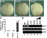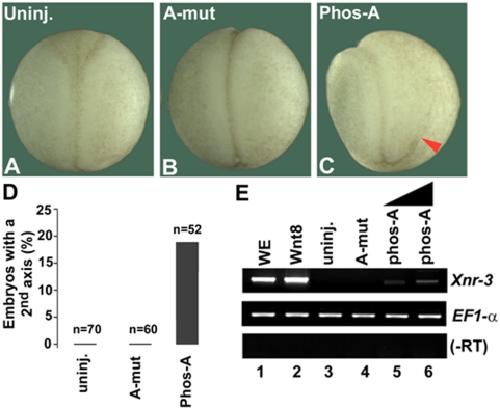 Figure 6. The Phos-A but not the A-mut peptide induces axis duplication and Xnr3 expression in Xenopus embryos.A, B, C, D. Uninjected embryo (A), A-mut-injected embryo (B), and Phos-A-injected embryo (C) shown at neural fold stage. The duplicated partial axis is labeled by the red arrowhead. Ventrally injected Phos-A (4.8 ng/embryo) induced axis duplication in 19% embryos (10 of 52). A-mut (4.8 ng/embryo) did not induce axis duplication (0 of 60). Three independent experiments were combined (D). E. Phos-A (3 and 4.8 ng/embryo) but not A-mut (4.8 ng/embryo) induced Xnr3 expression in animal pole explants, as assayed by RT-PCR. Xenopus Wnt8 RNA injection (8 pg/embryo) served as a positive control. The activity of the Phos-A peptide was significantly weaker than that of Wnt8 RNA, likely due to dilution, proteolysis and/or dephosphorylation in the embryo in the absence of any de novo synthesis. WE: whole embryo. EF1-a: loading control. –RT: without reverse transcriptase.
