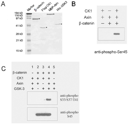 Figure 1. In vitro reconstitution of Axin-dependent and CK1 priming-dependent β-catenin phosphorylation by GSK3.A. Recombinant GST-β-catenin, Flag-CK1, MBP-Axin, and His-GSK3 proteins were expressed in bacteria or insect cells and purified by glutathione agarose, anti-Flag M2 agarose, amylose resin, or Ni-NTA resin, respectively. In the case of β-catenin, GST was cleaved via thrombin and purified away from β-catenin. * indicates each recombinant protein. B. β-catenin phosphorylation by CK1 was reconstituted in vitro using purified proteins. The phosphorylation reaction products were analyzed by western blotting using an anti-phospho-Ser45 β-catenin antibody. C. Axin-dependent phosphorylation by GSK3 was reconstituted in vitro using purified proteins. For Axin-dependent β-catenin phosphorylation in this and other figures, 0.43 µM of GSK3, 0.54 µM of CK1α, 0.21 µM of Axin, and 0.73 µM of β-catenin were used in each assay. The phosphorylation reaction products were analyzed by western blotting using an anti-phospho-Ser45 β-catenin antibody and an anti-phospho-Ser33/Ser37/Thr41 β-catenin antibody.