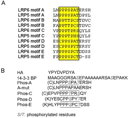 Figure 2. Peptide design according to the PPPSPXS motifs in human LRP6.A. Sequence alignment of the five PPPSPXS motifs in human LRP6 and LRP5 by the Cluster V program. The PPPSPXS motifs are highlighted in color and boxed. B. The sequences of synthetic peptides are shown. The PPPSPXS motifs in the peptides are underlined, and phosphorylated Ser/Thr residues are shown in italics. The C or K residue in the parenthesis at the amino terminus of peptides A, C, D, and E was introduced for protein conjugation purposes (during immunization for antibody production) [34], [37].