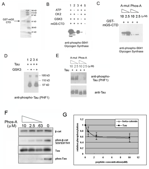 Figure 5. The phosphorylated PPPSPXS peptide inhibits phosphorylation of glycogen synthase and Tau by GSK3.A. Recombinant GST-tagged mouse glycogen synthase carboxyl-terminal domain (mGS-CTD) was expressed in bacteria, and purified by glutathione agarose resin. B. In vitro reconstitution of GS phosphorylation by CK2 and GSK3. The phosphorylation reaction products were analyzed using an anti-phospho-Ser641 GS antibody. C. GS phosphorylation at Ser641 was inhibited by Phos-A, but not by A-mut. The phosphorylation reaction products were analyzed using an anti-phospho-Ser641 GS antibody. D. In vitro reconstitution of Tau phosphorylation by GSK3. The phosphorylation reaction products were analyzed using an anti-phospho-Tau antibody (PHF1). E. Tau phosphorylation was inhibited by Phos-A, but not A-mut. The phosphorylation reaction products were analyzed using an anti-phospho-Tau antibody (PHF1). F and G. Different concentrations of Phos-A inhibited β-catenin and Tau phosphorylation by GSK3 in a similar manner. A four-fold dilution of Phos-A was employed. The graph represents the average of three independent experiments.