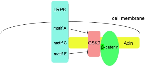 Figure 7. A working model for LRP6 inhibition of β-catenin phosphorylation by the Axin-GSK3 complex.While one of the five phosphorylated PPPSPXS motifs of LRP6 physically interacts with Axin, other phosphorylated PPPSPXS motifs may directly inhibit GSK3 phosphorylation of β-catenin in the Axin complex. Axin-binding to motif C is drawn arbitrarily. See Discussion for details.