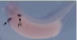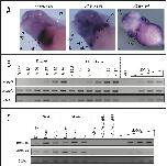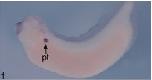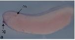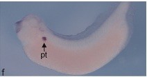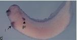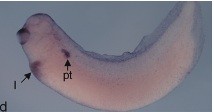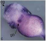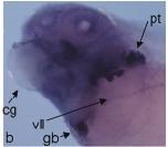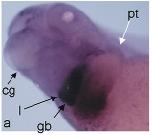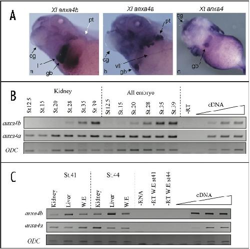 Figure 5. Comparison of anxa4a and anxa4b spatial expression. (A) Xenopus anxa4 genes are expressed in a common domain, the gall blad‐ der, in stage 41 embryos. In situ hybridization was carried out on X. laevis (a and b) and X. tropicalis (c) embryos. anxa4a (b) is expressed strongly in the pronephric tubules (pt) and also in the gall bladder (gb). anxa4b (a) is detected in the anterior part of the liver (l), in the gall bladder (gb) but not expressed in the pronephros (pt) (white arrow). Xt anxa4 (c‐ventral view) is only expressed in the gall bladder (gb). The cement gland (cg) is indicated to allow orientation of the embryos. (B) anxa4a and anxa4b expression is dif‐ ferent during pronephric development. RT‐PCR was performed with total RNA extracted from dissected kidneys from different stages of X. laevis embryos. anxa4a is expressed in the kidney throughout its formation whereas anxa4b is only expressed in this organ from stage 28. (C) anxa4a and anxa4b display different spatial expression at late tadpole stages. RT‐PCR was performed with total RNA extracted from dissected pronephric kidneys and livers from stages 41 and 44 X. laevis embryos (W.E.). At stage 41, anxa4a is slightly more expressed in the kidney than the liver and anxa4b is more highly expressed in the liver. At stage 44, this difference of expression is more highly pronounced
