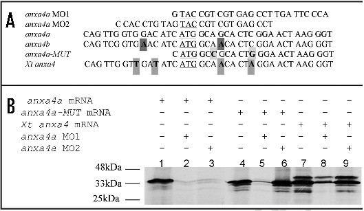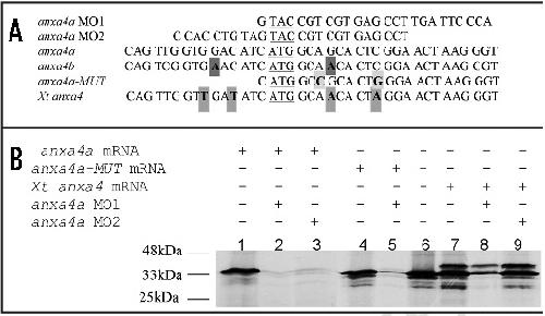 Figure 6. The anxa4 MO2 knocks down anxa4a but not Xt anxa4 transla‐ tion. (A) Alignment of the 5� sequences of X. laevis wild type and mutant anxa4 cDNA and its X. tropicalis homolog showing the complementarity of anxa4a MO1 and MO2 in relation to these cDNAs. The ATG is underlined and mismatch residues are indicated in bold. Four nucleotides (in grey) differ between Xt anxa4 cDNA and the MO2 sequence. Two mismatch nucleotides created in anx4a‐MUT cDNA are highlighted in light grey. Two nucle‐ otides (in dark grey) are different between anxa4b and MO2 sequences. (B) anxa4a MO2 does not interfere with Xt anxa4 translation; autora‐ diograph of an SDS‐PAGE analysis gel of in vitro translated 35S‐Methionine radio‐labelled anxa4 proteins. 0.5 mg of anxa4a mRNA was incubated alone (lane 1) or in combination with 10 mg of anxa4a MO1 (lane 2) or MO2 (lane 3). Both MO block the translation of anxa4a mRNA. 0.5 mg of anxa4a‐MUT mRNA was incubated either alone (lane 4) or in combination with 10 mg of anxa4a MO1 (lane 5) or MO2 (lane 6). Translation of the mutant mRNA is severely affected by MO1 but unaffected by MO2. 0.5 mg of Xt anxa4 mRNA was incubated alone (lane 7) or in combination with 10 mg of anxa4a MO1 (lane 8) or MO2 (lane 9). MO2 does not block the translation of Xt anxa4 whereas the addition of MO1 affects its translation. These results demonstrate that Xt anxa4 can be used to rescue MO2.