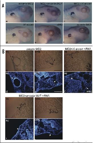 Figure 7. Anxa4 function is conserved between X. laevis and tropicalis. (A) Embryos were injected in the V2 blastomere of the 8‐cell stage with 20 ng of anxa4a MO2 alone (a) or with 5 ng of anxa4a‐MUT mRNA (b) or with Xt anxa4 mRNA (c), cultured until stage 41 and subjected to whole‐mount anti‐ body staining with the pronephric tubule specific antibody 3G8. Five nano‐ grams of Xt anxa4 mRNA (d), 20 ng of cMO (e), 20 ng of anxa4a MO1 (f) were also injected as controls. LacZ (2 ng) was used as lineage tracer in all injections. Embryos injected with MO1 and MO2 show similar phenotype, with shortened, enlarged tubules whereas cMO injection does not affect the tubule morphology. Overexpression of Xt anxa4 induces no apparent phenotype; however, as anxa4a‐MUT mRNA, it is able to rescue the MO2 phenotype. (B) Cryostat transverse sections of stage 41 Xenopus pronephroi stained with tubule‐specific antibody 3G8 and counterstained with Hoechst. The slides were inspected under white light (a�c, g�h) to identify 3G8 stained tubules and the LacZ stained injected side (inj) (a, c and g) and under UV illumination to identify Hoechst nuclei staining (d�f, i�j). Embryo injected with anxa4a MO2 displays enlarged pronephric tubule phenotype on the injected side (inj) (a and d) compared to the uninjected side (uninj) (b and e). Embryo co‐injected with anxa4a MO2 and anxa4a‐MUT mRNA shows rescue of the phenotype [compare g and h (injected side) to i and j (uninjected side)]. No differences between the injected and the uninjected sides can be observed in embryo co‐injected with anxa4a MO2 and Xt anxa4 mRNA (c and f).