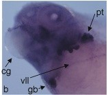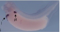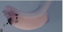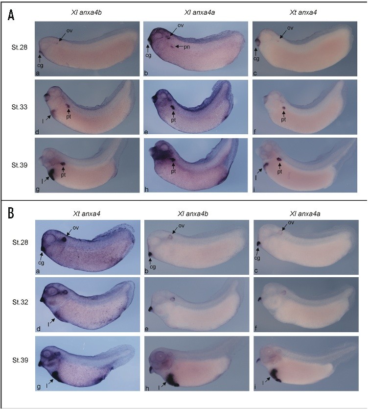 Figure 4. Comparison of in situ expression patterns of the three orthologs in X. laevis and tropicalis embryos. (A) anxa4 probes from each the Xenopus orthologs identify distinct in situ expression domains on X. laevis embryos. anxa4a and anxa4b can be detected from stage 28 in the cement gland (cg) and weakly in the otic vesicles (ov) (a and b). Expression of anxa4a in the pronephric anlagen (pn) can be first observed at stage 28 (b) and from stage 33 in the developing tubules (pt) (e and h). anxa4b is also in the pronephric tubules (d and g) but in a transitory manner, being lost from this region in later stage embryos (data not shown). anxa4b is expressed strongly in the developing liver (l) from stage 33 (d and g). A combination of the two expression pat‐ terns is detected with Xt anxa4 probe, which shows similar homology to both X. laevis genes. Strong staining in the pronephric tubules (pt) can be observed from stage 33 (f) and in the liver (l) at stage 39 (i). (B) Anxa4 probes from each of the Xenopus orthologs show identical in situ expression patterns on X. tropicalis embryos. Xt anxa4 is first detected in the cement gland (cg) and otic vesicle (ov) at stage 28 (a) and remains expressed in these two organs throughout their development (d and g). From stage 32, expression can be seen in the liver (l) (d). Xt anxa4 remains strongly expressed in this organ at later stages (g). The same expression pattern is detected with both anxa4a (c, f and i) and anxa4b (b, e and h) probes, although as expected the signal is weaker since probes are being used cross‐species, confirming the homology of these genes.