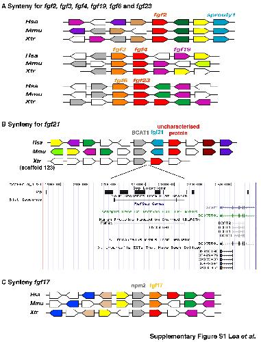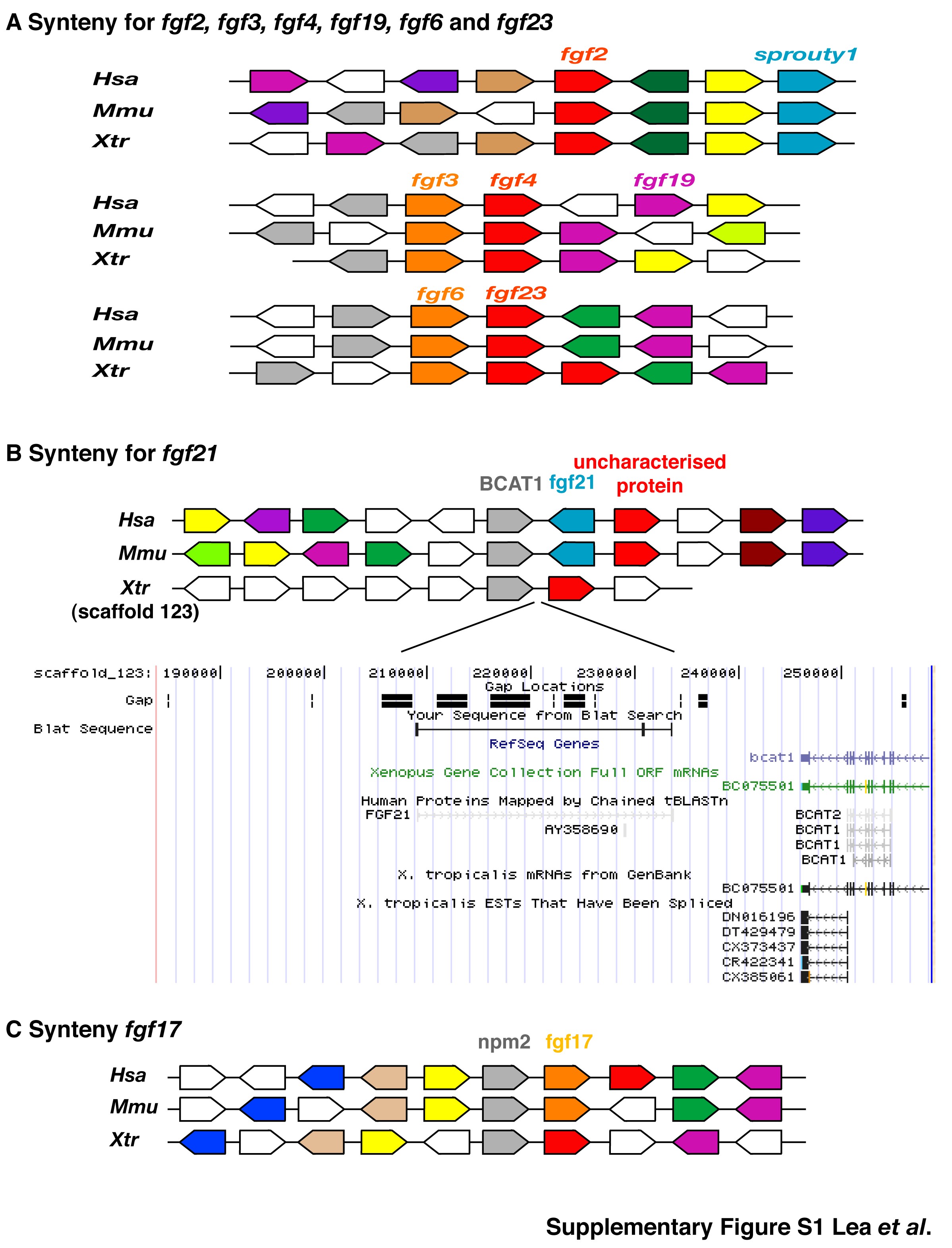 Supp. Fig. S1. Analysis of the genomic locus surrounding X. tropicalis fgf genes. A: Synteny of fgf 2, fgf3, fgf4, fgf19, fgf6, and fgf23 were analysed for human, mouse, and Xenopus tropicalis. Chromosomal loci were constructed from Metazome (http://www.metazome.net/) showing the high level of conservation of the gene loci surrounding fgf genes. For each alignment, boxes with the same colour correspond to the same gene; white boxes correspond to genes without annotation or without orthologues in the species shown here. Hsa = Homo sapiens; Mmu = Mus musculus; and Xtr = Xenopus tropicalis. B: Identification of a partial sequence of fgf21. By synteny analysis, we have identified the region corresponding to the fgf21 locus in Xenopus tropicalis. We then used an EST for Xenopus laevis fgf21 (accession number EB470635) to identify the sequence in the X. tropicalis genome. This region of the genome contains numerous gaps (black boxes), which probably explain why we were unable to identify the full sequence. C: Identification of the genomic locus where fgf17 would be expected to be located. Our efforts to find X. tropicalis fgf17 were unsuccessful despite a fairly complete sequence around this region of the genome. Hsa = Homo sapiens; Mmu = Mus musculus; Xtr = Xenopus tropicalis.