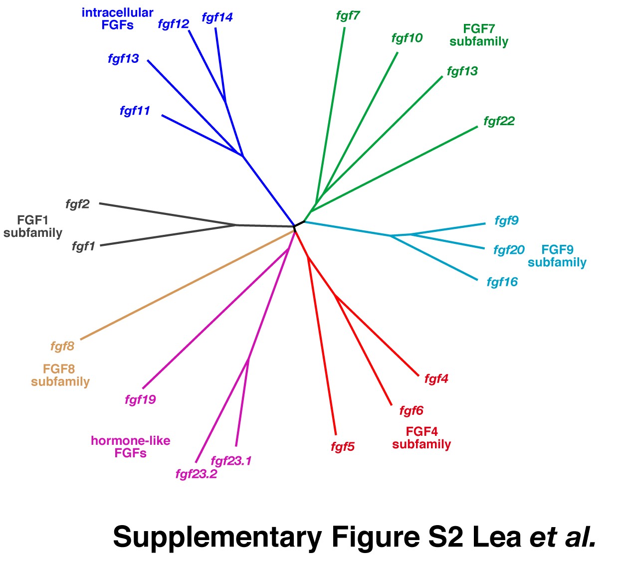 Supp. Fig. S2. Phylogenetic tree of fgf sequences. Unrooted N-J phylogenetic tree of fgf sequences using CLUSTALW (http://align.genome.jp/) showing the subdivision of the different fgfs into seven subfamilies in Xenopus tropicalis.