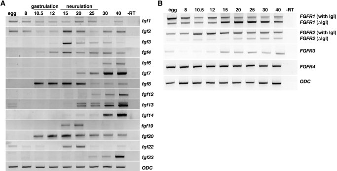 Figure 1. Temporal expression of fgf ligands and receptors. A: Temporal expression of fgf genes by RT-PCR. B:Temporal expression of fgfr genes by RT-PCR. In A and B, embryos were harvested for RNA extraction at the indicated stages, and RT-PCR analysis was performed using the oligonucleotides and conditions described in Supp. Table 1. The housekeeping gene ornithine decarboxylase (ODC) was used as a control for equal loading. -RT lane is a negative control using RNA from st40 without the addition of reverse transcriptase.
