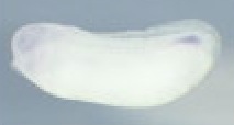 fgf8 (fibroblast growth factor 8) gene expression in Xenopus tropicalis embryo, assayed via in situ hybridization, NF stage 15, anteriodorsal view, posterior up.