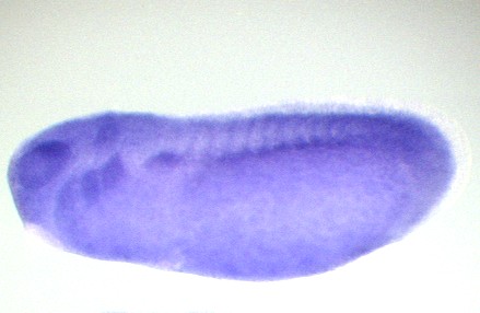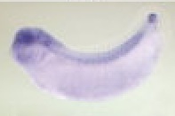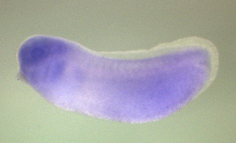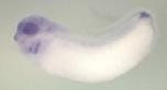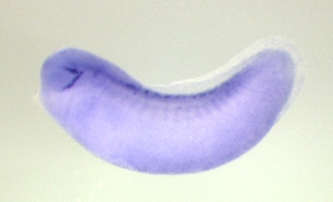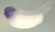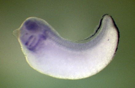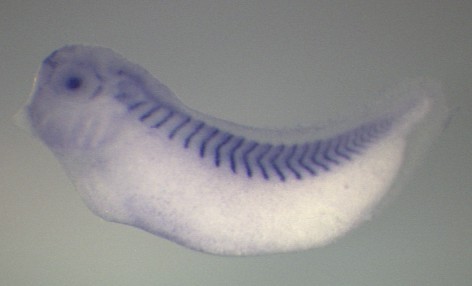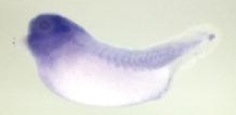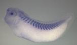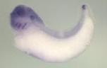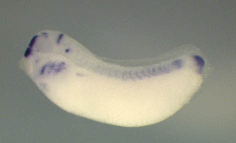 fgfr1 (fibroblast growth factor receptor 1 ) gene expression in Xenopus tropicalis embryo, assayed via in situ hybridization, NF stage 28, lateral view, anterior left, dorsal up.
