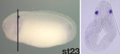 fgf10 (fibroblast growth factor 10) gene expression in Xenopus tropicalis embryo, assayed via in situ hybridization, NF stage 23, left: lateral view, anterior left, dorsal up. right: in cross section, through otic placode, dorsal up.