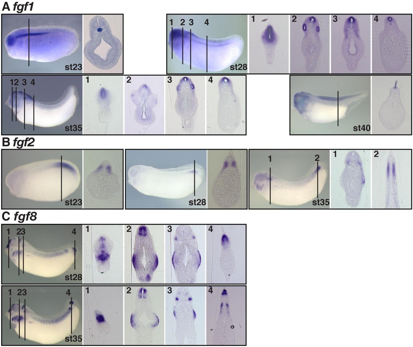 Figure 2. Analysis of the spatial expression patterns of the fgf1, fgf4, and fgf8 subfamilies. A: Whole mount in situ hybridisations of fgf1 and fgf2 at the indicated stages. B: Whole mount in situ hybridisations of fgf4 and fgf6 at the indicated stages. C: Whole mount in situ hybridisations of fgf8. For stage 10.5, the images are vegetal views; for stage 15, the images are dorsal views; and for stage 23, 28, 35, and 40, the images are lateral views (anterior is left, posterior is right, dorsal is up, and ventral is down). A schematic representation of a Xenopus embryo at stage 28 with the different embryonic tissues labelled is presented in Supp. Figure S3.