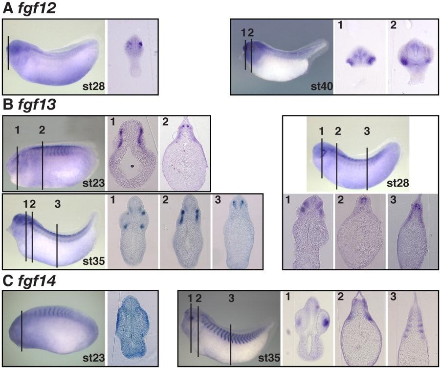 Whole mount in situ hybridizations of fgf14 at the indicated stage of 35.
