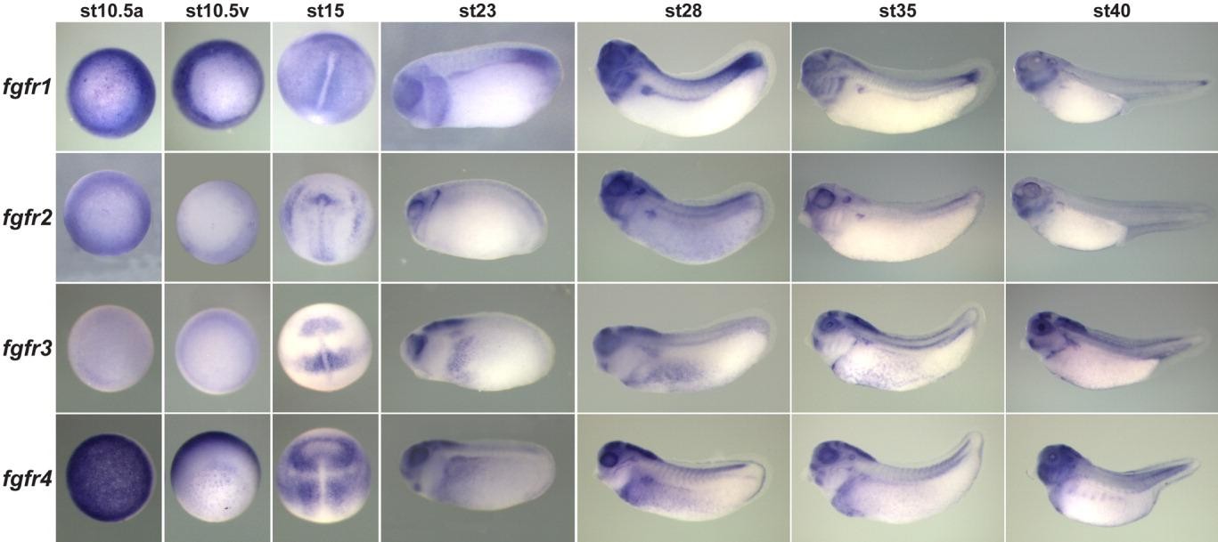 Figure 8. Spatial expression of the fgfr genes during early Xenopus tropicalis development. Antisense probes specific for each receptor were generated from the constructs indicated in Supp. Table 2 and in situ hybridisations were performed. 10.5a shows animal views and 10.5v shows vegetal views of gastrulating embryos, and stage15 presents dorsal views of a neurulating embryo. Stage 23, 28, 35, 40 are lateral views with anterior left and dorsal up. A schematic representation of a Xenopus embryo at stage 28 with the different embryonic tissues labelled is presented in Supp. Figure S3.