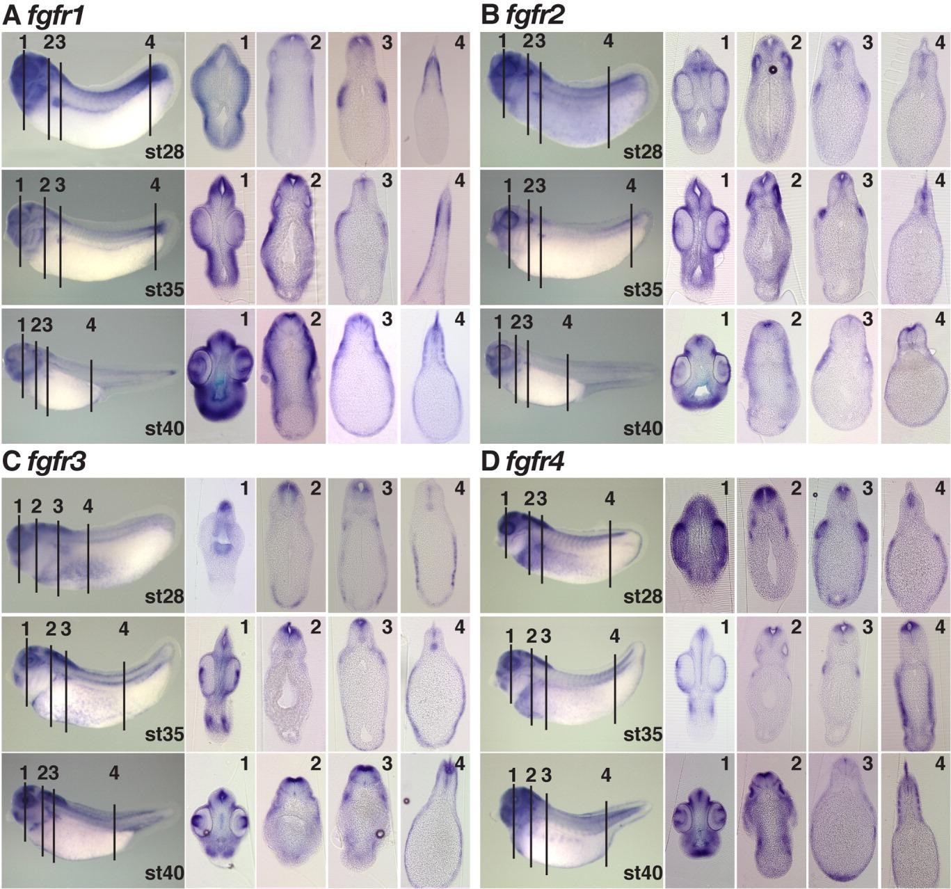 Figure 9. Cross-section analysis of the spatial expression patterns of the fgfrs. Coronal sections of indicated fgfrs from the whole mount in situ hybridisation shown in Figure 8. The black lines indicate the position of the sections shown. The sections labelled ldquo 1 rdquo are all at the level of the eye; the sections labelled ldquo 2 rdquo are through the otic vesicle; the sections labelled ldquo 3 rdquo are at the level of the pronephros; and the sections labelled ldquo 4 rdquo are in the tail of the embryo. In all sections, dorsal is up and ventral is down.