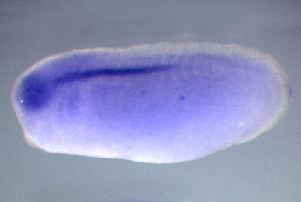 fgf (fibroblast growth factor 1 (acidic)) gene expression in Xenopus tropicalis embryo, assayed via in situ hybridization, NF stage 23, lateral view, anterior left, dorsal up.