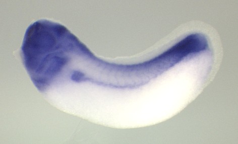 fgf9 (fibroblast growth factor 9) expression in Xenopus tropicalis embryo, assayed via insitu hybridization, NF stage 28, lateral view, anterior left, dorsal up.