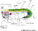 Supp. Fig. S3. Schematic representation of a Xenopus embryo at stage 28. A schematic representation of a stage-28 embryo with the different tissues coloured and annotated. The yellow-green area at the very anterior of the embryo includes the forebrain, anterior mesoderm, and the anterior placode area. Just posterior in brown is the olfactory placodes. The eye is in purple with the lens in dark purple. The trigeminal nerve is in pink and the otic vesicle in orange. The grey area represents the branchial arches. The neural tube is yellow with the Midbrain-Hindbrain Boundary in dark pink. The notochord in red runs ventral to the neural tube. The light blue stripes represent the somites and the blue area posterior to the somites is the presomitic mesoderm. The tailbud is in dark blue. The pronephric tubules and duct are in burgundy. The fin core is in dark green while the fin crest is in light green.
