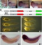Figure 1. Development of the M1 transgenic line of Xenopus laevis. A-D: Endogenous expression of Msx1 in Xenopus hindlimbs from stage 52 to 55. Scale bars = 250 mu m, and limbs are oriented with distal to the left and posterior uppermost. Expression is restricted to the distalmesenchyme and excluded from the apical epidermal ridge (AER; black arrowheads in A). There is also an early proximal-anterior located expression (white arrowhead, A). Later expression is interdigital. E: Schematic representation of the eveMsx1 transgene. At 24 or below, the transgene is silent. At 34, however, heat shock factors (black circles) bind to the hsp70 promoter sequence and activate transcription of eveMsx1. The construct is fused to a second transgene containing the gamma -crystallin promoter driving green fluorescent protein (GFP). F,G: Phenotypes of tadpoles following heat shock at stage 14. WT embryos develop normally and are unaffected by the heat shock (F). Transgenic tadpoles have a flattened anteriorhead, reduced eye size, reduced number of melanocytes (pigment cells), and a shortened tail (G). H,I: In situ hybridization using an Msx1 probe to show the normal expression of Msx1 (H) is expanded and up-regulated in heat shocked transgenic animals (I).