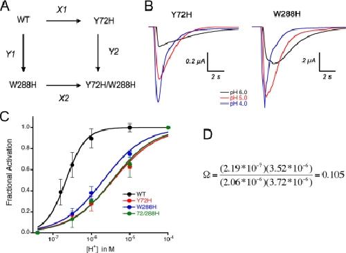 FIGURE 3. Double mutant cycle analysis of rASIC1 His mutants in positions 72 and