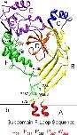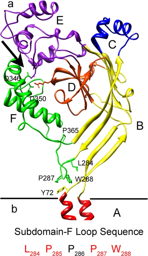 single subunit is shown for simplicity with subdomains, A to F, indicated in