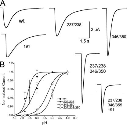 FIGURE 2. Functional effect of mutations in rat ASIC1. A, whole-cell
