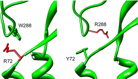 FIGURE 5. Representation of Arg in positions 72 and 288 in ASIC1. The figure