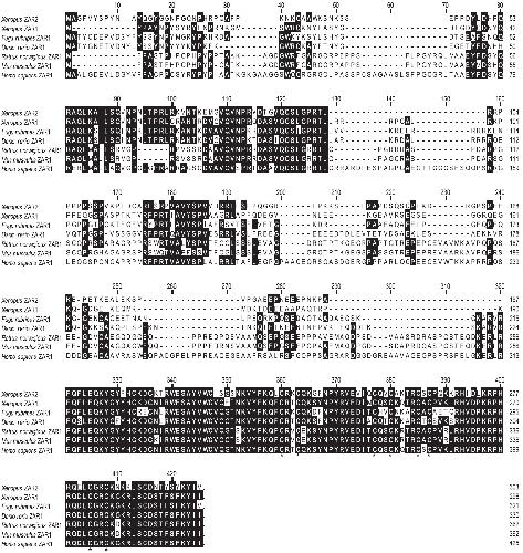 Figure 4 Amino acid sequence alignment of Zar2 and Zar1 proteins from Xenopus, pufferfish, zebrafish, rat, mouse and human. Alignment
