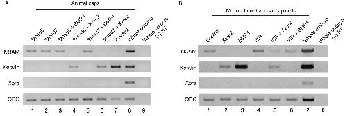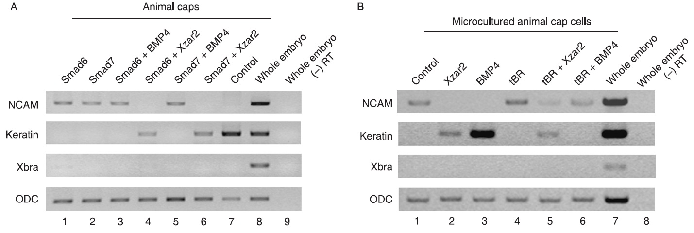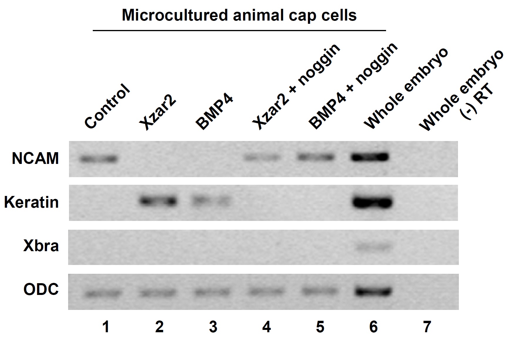 Xzar2 and BMP4 converted the cell fate from neural to epidermal. Lane 4 is from the intact animal caps, which expressed the epidermal