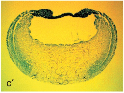 Zar2 (ZAR1-like protein) gene expression in Xenopus laevis embryo, assayed via in situ hybridization, NF stage 12, lateral view of sagittal section, animal up, dorsal axis on right.