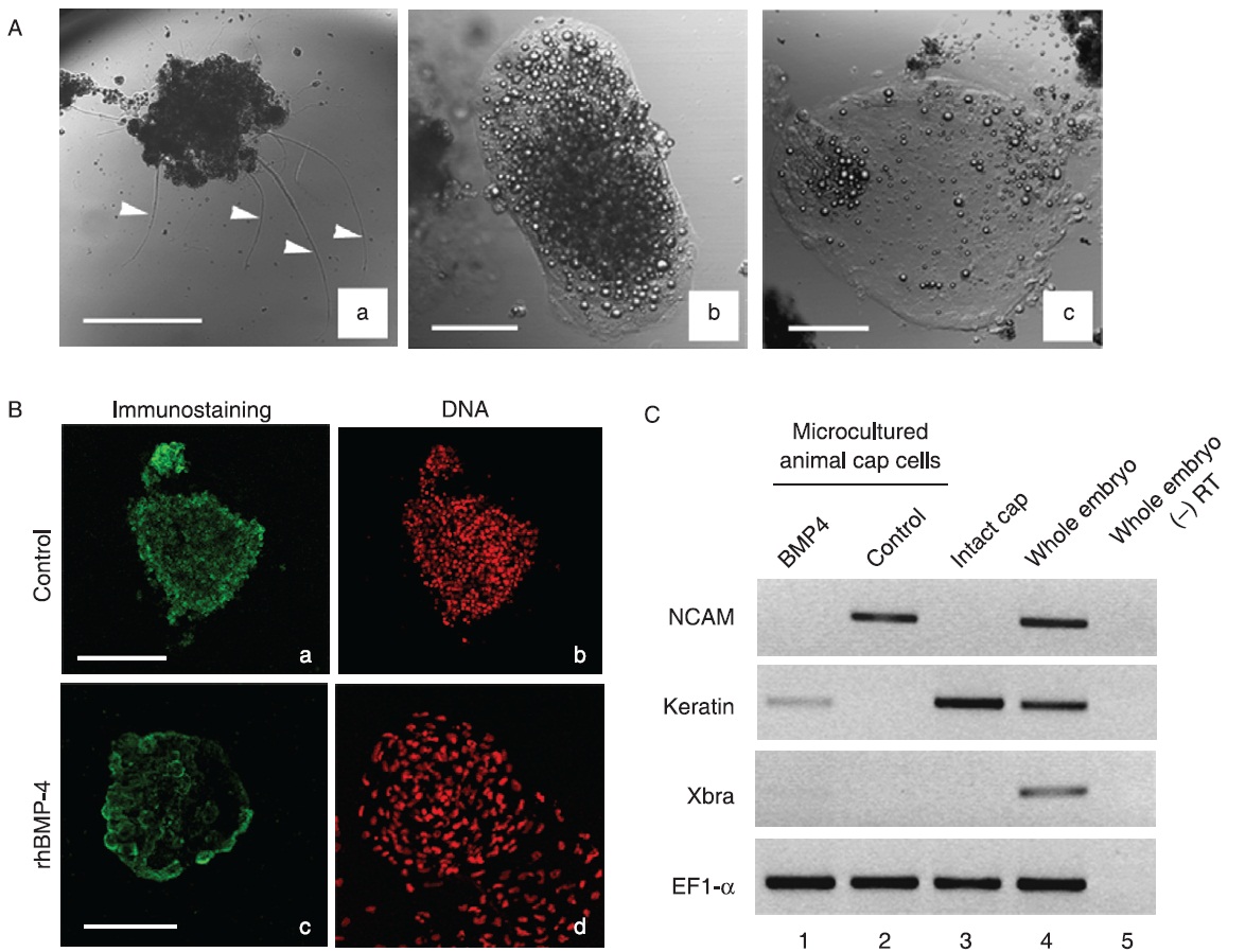 cultured in control condition. The cells developed nerve fibers (arrowheads). Bar = 200 μm. b, c: Dissociated animal cap cells incubated