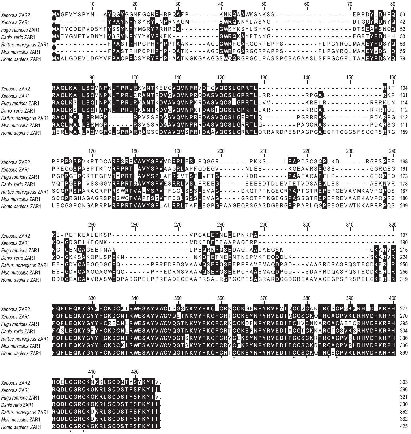 Bank accession numbers are as follows: Xenopus Zar2, AB190316; Xenopus Zar1, AY283176; Fugu rubripes Zar1, AY283177; Danio rerio
