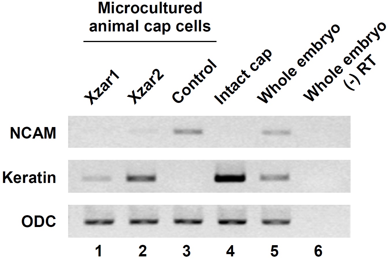 keratin and did not express the neural gene (NCAM). Lanes 5 and 6 are whole embryos with (lane 5) and without (lane 6) reverse transcriptase