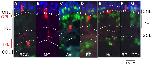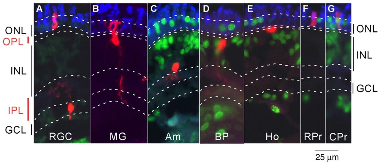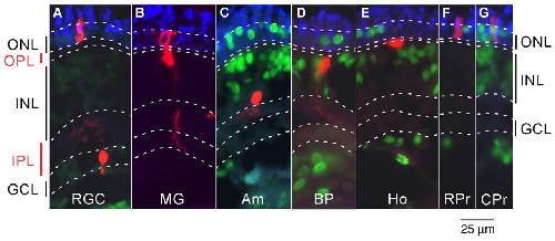 Fig. 1. GFP+ retinal sections of stage 41 Xenopus tadpoles. Immunolabeled for GFP (red), BrdU (green) and rhodopsin (blue). Sclerad is up, vitread is down. Each cell type has a readily recognized morphology. Am, amacrine cell; BP, bipolar cell; CPr, cone cell; GCL, ganglion cell layer; Ho, horizontal cell; INL, inner nuclear layer; IPL, inner plexiform layer; MG, Müller glia; ONL, outer nuclear layer; OPL, outer plexiform layer; RPr, rod cell; RGC, retinal ganglion cell.