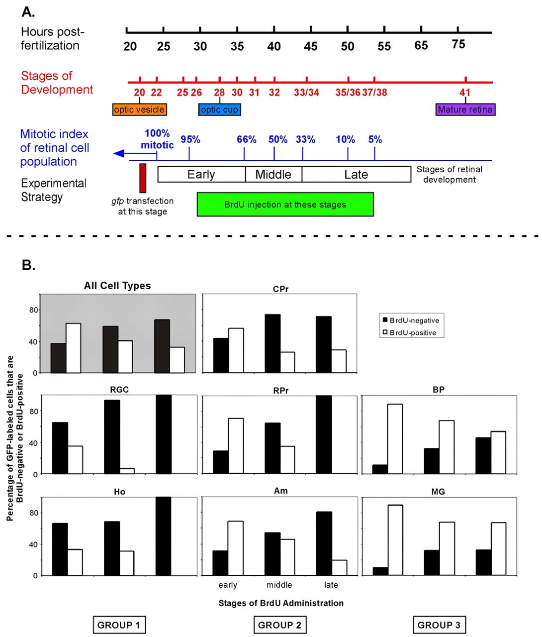 Fig. 4. Mitotic landmarks of retinal development in Xenopus laevis and the pattern of genesis of the seven major cell types at the population level. (A) The timing of gfp transfection and BrdU injection according to three different scales: (1) hours post-fertilization at 22â24°C; (2) embryonic stage according to Nieuwkoop and Faber (Nieuwkoop and Faber, 1967); and (3) mitotic index of retinal cell population [modified from Holt et al. (Holt et al., 1988)]. (B) The frequency of BrdU+ and BrdUâ cells of each phenotype for three stages of retinogenesis. Every cell type was generated at early and middle periods, and all but RGC, Ho and RPr were produced at the late period.