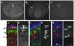 Fig. 2. Retinal sections of stage 41 Xenopus containing clusters of GFP-labeled cells. Sections were immunolabeled as in Fig. 1. (A,B,C,E,G,I) Monochrome images showing GFP labeling only. (A) BrdU injected at stage 30. This cluster has at least one member in each of the retinal layers, and they are tightly radially aligned. (B,C) BrdU injected at stages 33/34 (B) and 30 (C). Clusters contain radially aligned cells in the ONL and INL, except C, where one cell exhibits some tangential dispersion. (D-I) Pairs of images from the same clone; E,G,I show only the GFP label allowing identification of cell phenotype. The BrdU labeling of each cell is indicated by the color of its identifier: yellow, BrdU+; blue, BrdUâ. (D,E) BrdU injected at stages 33/34. In Clone #146, the RPr were post-mitotic at the time of BrdU administration, but the BP and Am were not yet post-mitotic. (F,G) BrdU injected at stage 31. In Clone #90, an RGC and an RPr are BrdUâ whereas two BP and an Am are BrdU+. (H,I) BrdU injected at stages 33-36. In Clone #153, all members are BrdUâ.