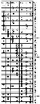Fig. 5. Representation of 51 clones containing heterogeneous BrdU labeling, plus five each of randomly selected clones with all BrdU+ and all BrdUâ profiles. When the retinal phenotypes (columns) are ordered as shown, we see a smooth transition from white (BrdU+) to black (BrdUâ) that sweeps from the top right to the bottom left. Empty box, no cells present; white circle, all cells BrdU+; black circle, all cells BrdUâ; half-black half-white circle, some cells BrdUâ, some BrdU+. Arrows indicate the clones that do not fit the overall sequence. Asterisks indicate the clones shown in Fig. 2D-G.