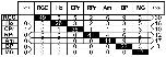 Fig. 6. A matrix of pairwise comparisons of clones where one phenotype (reference) is 100% BrdU–, but the others (comparisons) are 100% BrdU+. This analysis reveals that the order of retinal cell birth is highly regular. Black boxes indicate the number of clones of the reference cell phenotype, i.e. the number of clones that exclusively contain BrdU– cells of this phenotype. White boxes indicate the number of clones of the comparison cell phenotype, i.e. the number of comparison clones that exclusively contain BrdU+ cells for a given reference phenotype. For example, of the 26 clones for horizontal cells (all Ho BrdU–), there are three cone clones (all CPr BrdU+).