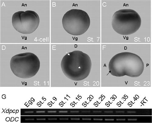 The spatial and temporal expression patterns of xdpcp. AâD, lateral views of the cleavage, blastula, and gastrula stage embryos showing xdpcp expressed in the animal regions. E, anterior view of a neurula stage embryo with dorsal at the top. The white arrow and arrowhead indicate the paraxial mesoderm and anterior neural plate region. F, lateral view of a tailbud stage embryo with anterior at the left. The black arrow indicates the head region. G, RT-PCR analysis showing the temporal expression patterns of xdpcp in Xenopus early development. Stages are indicated above the lanes. Ornithine decarboxylase (ODC) serves as a loading control. The PCR cycles consisted of denaturation at 94 °C for 1 min, annealing at 55 °C for 1 min, and extension at 72 °C for 1 min for 25 cycles. An, animal; Vg, vegetal; D, dorsal; V, ventral; A, anterior; P, posterior.