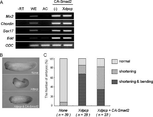 Xdpcp acts upstream of Smad2. A, RT-PCR analysis revealing that Xdpcp cannot inhibit the expression of mesendodermal markers induced by CA-Smad2 in animal cap tissues. WE and âRT, control RT-PCR on the whole embryo RNA in the presence or absence of reverse transcriptase; AC, uninjected animal cap cells; (â), the animal cap cells injected with CA-Smad2 RNA alone. Ornithine decarboxylase (ODC) serves as a loading control. B, the morphological defects by xdpcp overexpression are partially rescued by CA-Smad2. C, the graph showing the results of panel B.
