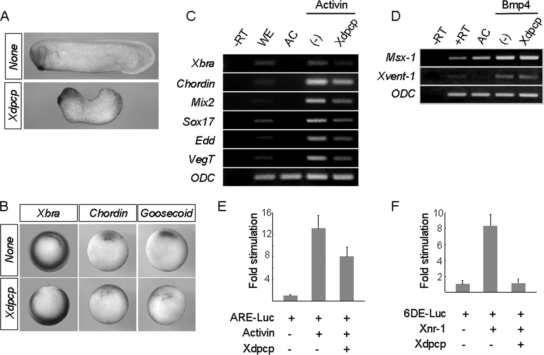Overexpression of xdpcp leads to defects in mesendoderm formation. A, xdpcp RNA (2 ng)-injected embryos show mesodermal defective phenotype. B, dorsal injection of xdpcp RNA inhibits the expression of endogenous mesodermal markers such as xbra, chordin, and goosecoid (gsc). Four-cell stage embryos were injected into the dorsal regions with 2 ng of xdpcp RNA or none, cultured until stage 10, and then subjected to in situ hybridization. C and D, RT-PCR analysis revealing that Xdpcp inhibits the expression of mesendodermal markers induced by activin in animal cap tissues, whereas it does not affect the expression of the Bmp target genes. +RT and âRT, control RT-PCR on the whole embryo RNA in the presence or absence of reverse transcriptase; AC, uninjected animal cap cells; (â), the animal cap cells injected with activin-βB or bmp4 RNA alone. Ornithine decarboxylase (ODC) serves as a loading control. E and F, luciferase assays in Xenopus embryos injected with combinations of indicated reagents. The amount of injected reagents is as follows: activin-βB RNA, 5 pg; Xnr-1 RNA, 100 pg; xdpcp RNA, 2 ng; ARE-Luc reporter DNA, 40 pg; 6DE-Luc reporter DNA, 40 pg. Error bars represent the standard deviation.